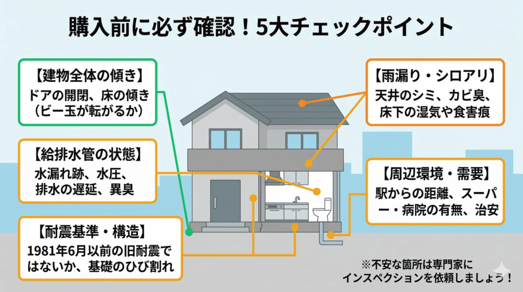雨漏りやシロアリ被害の有無も、築古物件では必ず確認しておきたいポイントです。